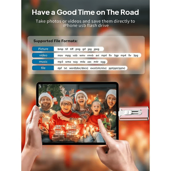 【Watch Movies, Photos and Play Music Directly From Phone Flash Drive】Store your favorite videos, audios and music on your iPhone's Photo Stick, then seamlessly plug and play on your iPhone or iPad anytime, anywhere. No more need for Internet or WiFi.This iPhone storage device plays videos in many different formats.Pictures stored on the Phone storage device also support different formats. Great way to store all your pictures and videos on an phone external storage device.